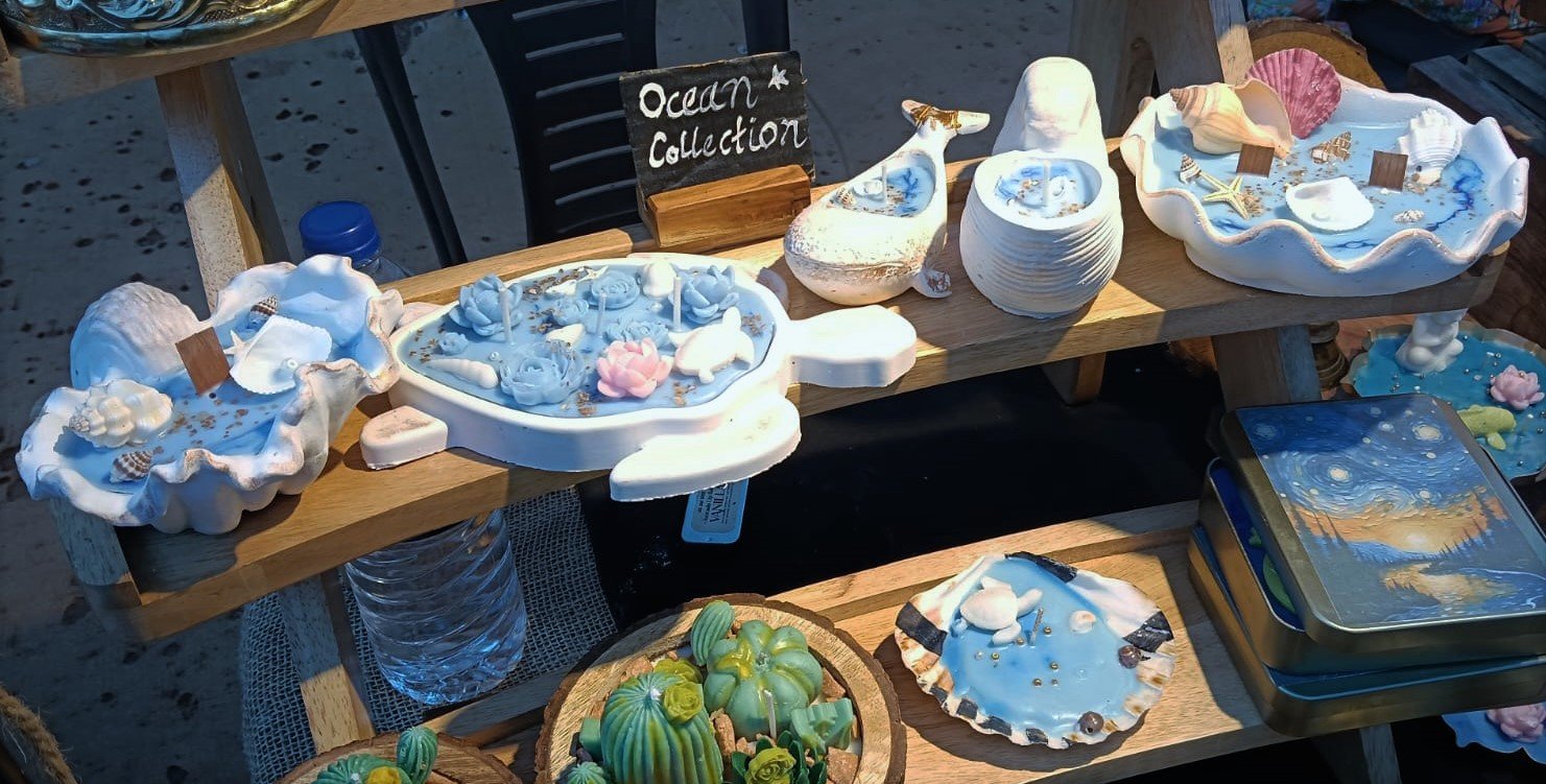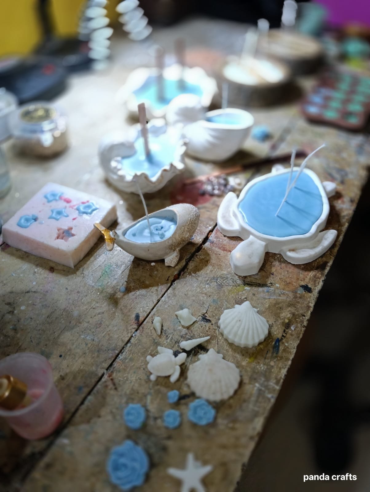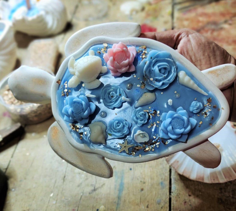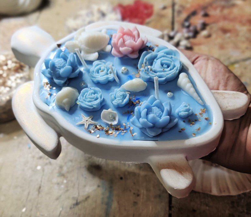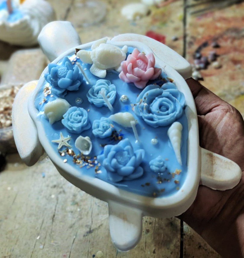 Its ocean-blue wax surface is adorned with delicately hand-moulded marine elements like sculpted lotuses, roses, mini turtle and real shells, starsfish, and glass pearls and finished with shimmering gold mica mineral details. Every element is entirely handmade, making each piece one of a kind. Thoughtfully designed to evoke peace and emotional grounding, this candle is both a work of art and a soulful experience.